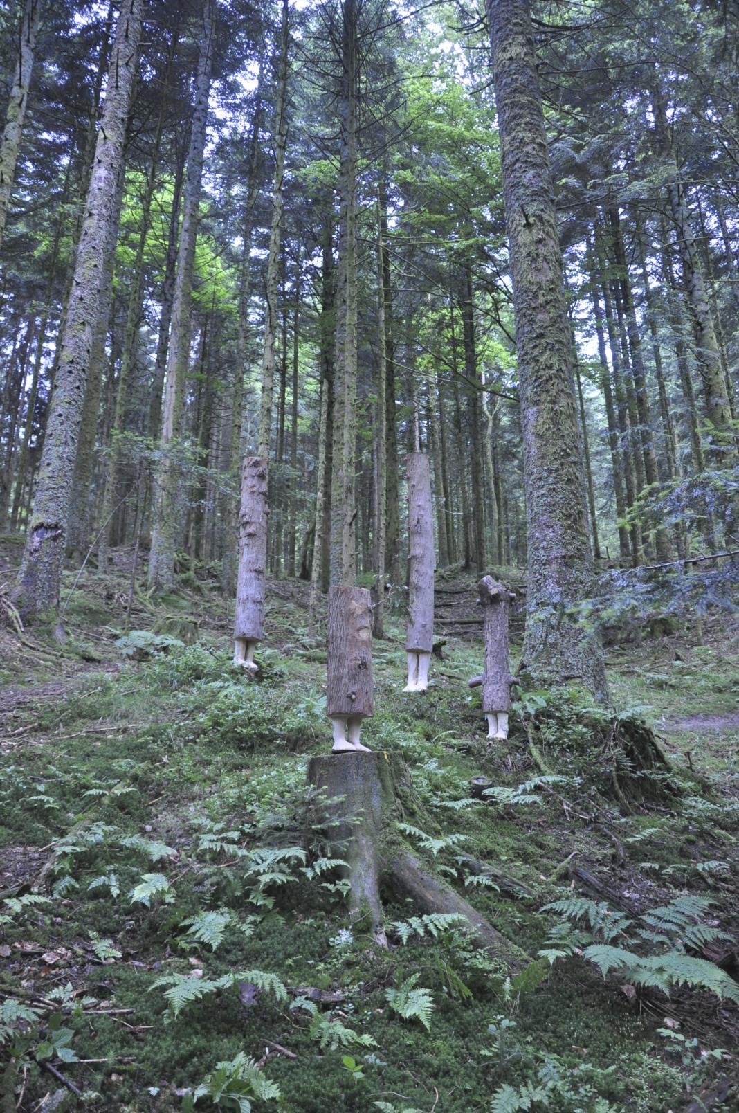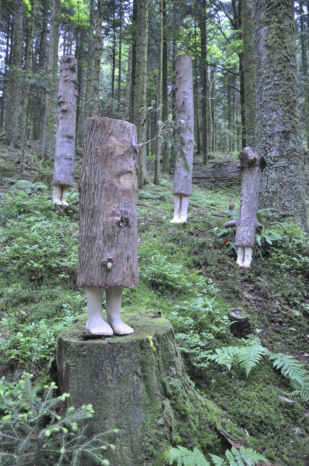 Les troncs, installés en pleine forêt, jouent avec les futaies. Les pieds dans l'humus, une présence se cache discrètement.